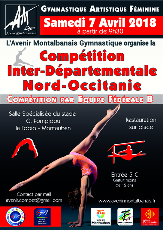 - Salle spécialisée du Gymnase Pompidou, 2B Rue Léon Jouhaux, La Fobio, 82000 Montauban (accès google map: suivre Maison des Arts Martiaux). Accueil des gymnastes dés 8H (8H30 pour les spectateurs)