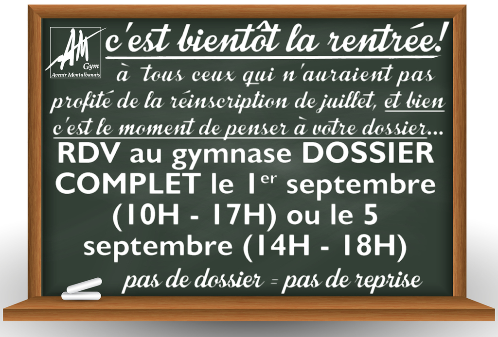 RDV au gymnase DOSSIER COMPLET soit le 1er septembre de 10H à 17H ou le 5 septembre de 14H à 18H.