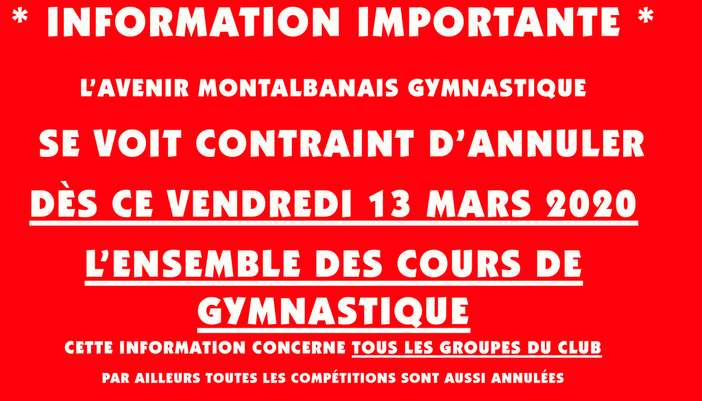 D'ANNULER DES CE VENDREDI 13 MARS 2020, L'ENSEMBLE DES COURS DE GYMNASTIQUE